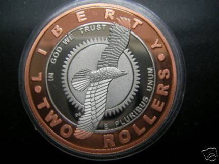 2009 Astronaut $2 Concept coins. In early 2009, a seller in Hong Kong sold the coins shown below on eBay. These are unauthorized copies of coins that I originally minted several years prior to 2009 (but with a "2009" date). The Chinese counterfeits have obvious similarities and differences. The most notable difference being the poorly-defined details, especially the "Mr. Bill" representation of the Astronaut's face. Note that the copies have the designers initials ("DC") on both sides and the "D" mint mark on the obverse - just like the genuine article. The counterfeits are reportedly larger than the originals - 35mm in diameter rather than 30mm. The fakes appear to have a white metal center (probably nickel). There are two different types of forgeries - one with a brass-colored outer ring and one with a copper-colored outer ring. The type I produced was 30mm in diameter with a 999 silver center (1/4 troy oz) and a brass outer ring (with satin and proof-like finishes). In 2008 I sold out of my mintage of these and have not offered any for sale since then. |